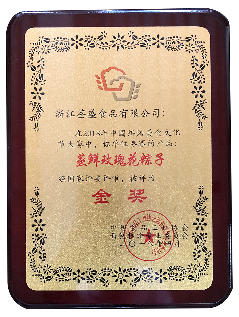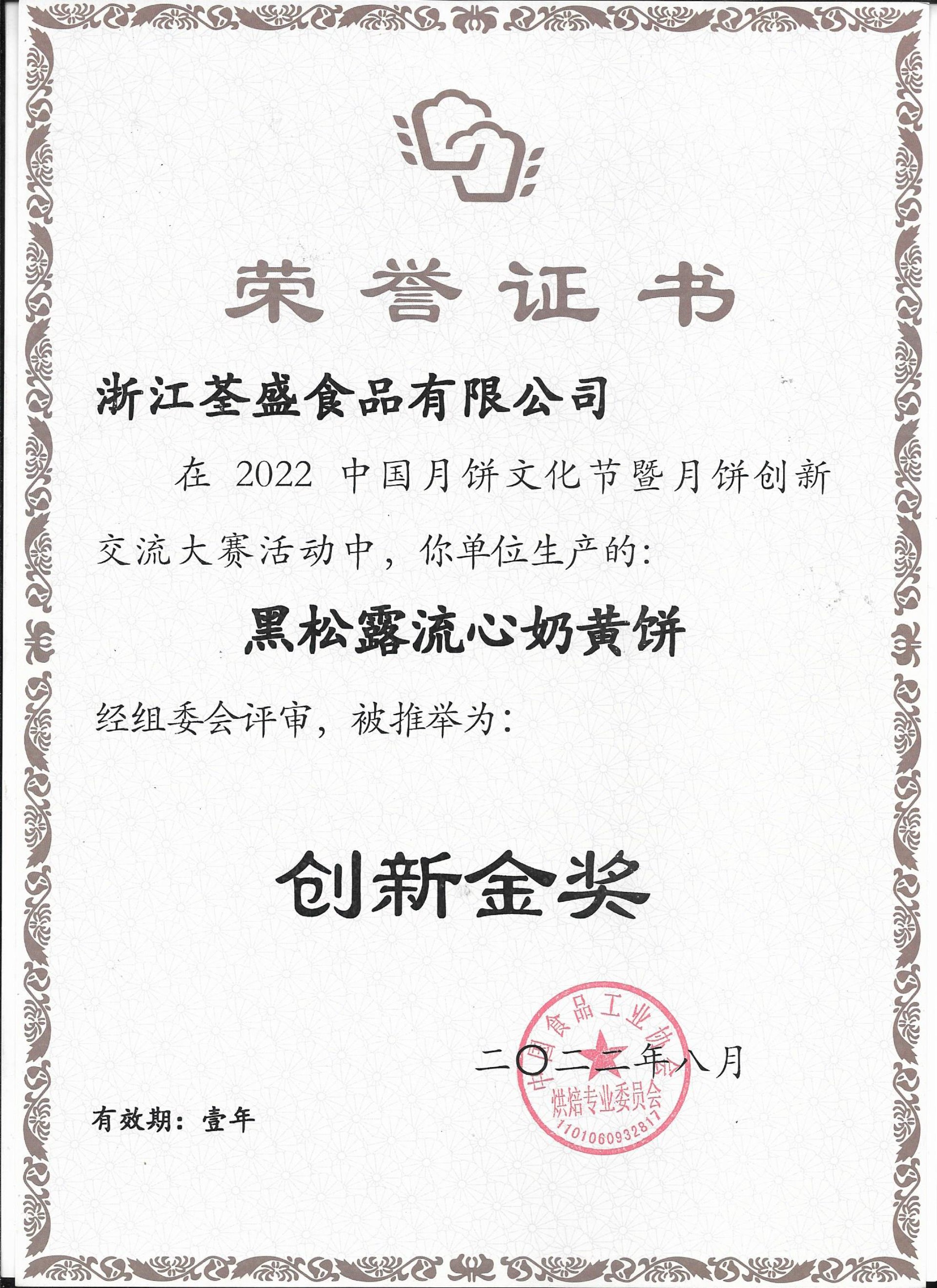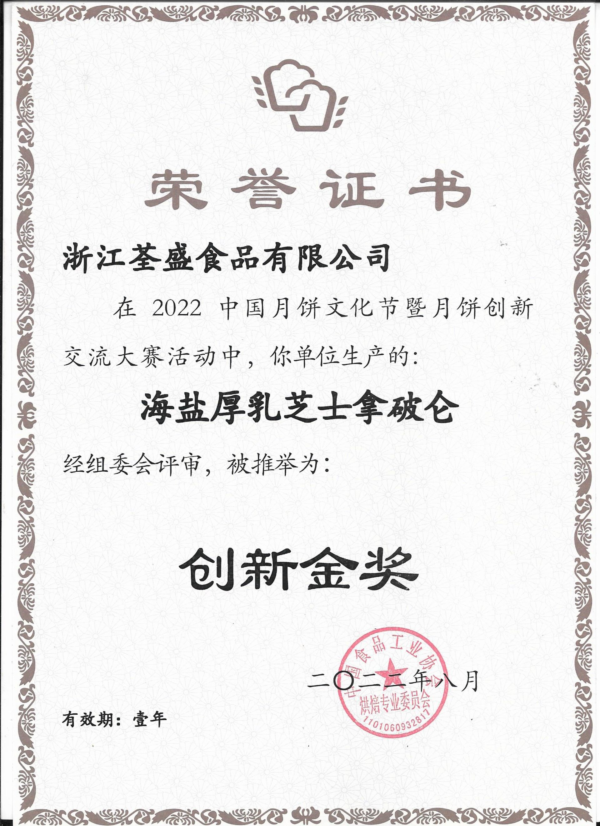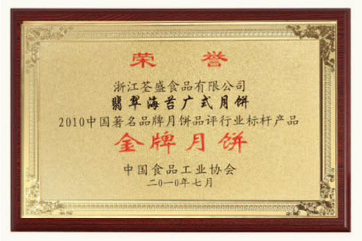 3. 中國(guó)食品工業(yè)協(xié)會(huì)授予荃盛《翡翠海苔廣式月餅》“金牌月餅”;
