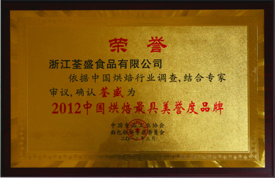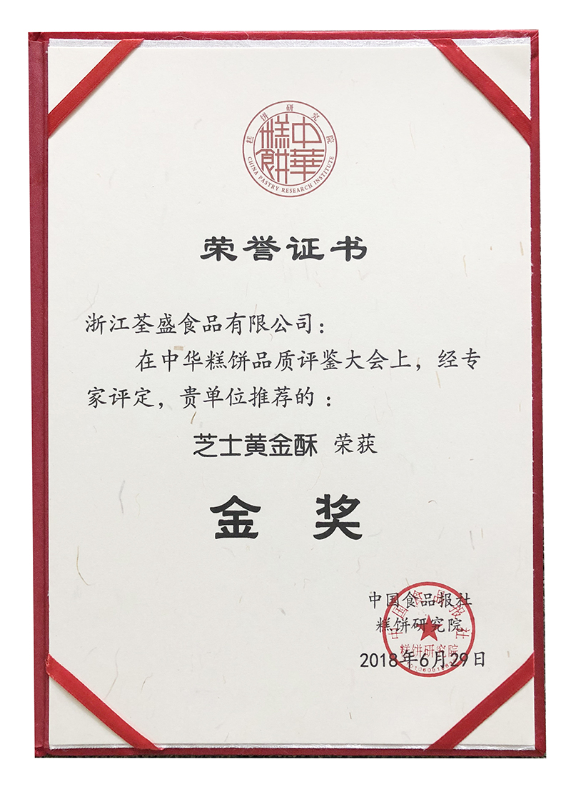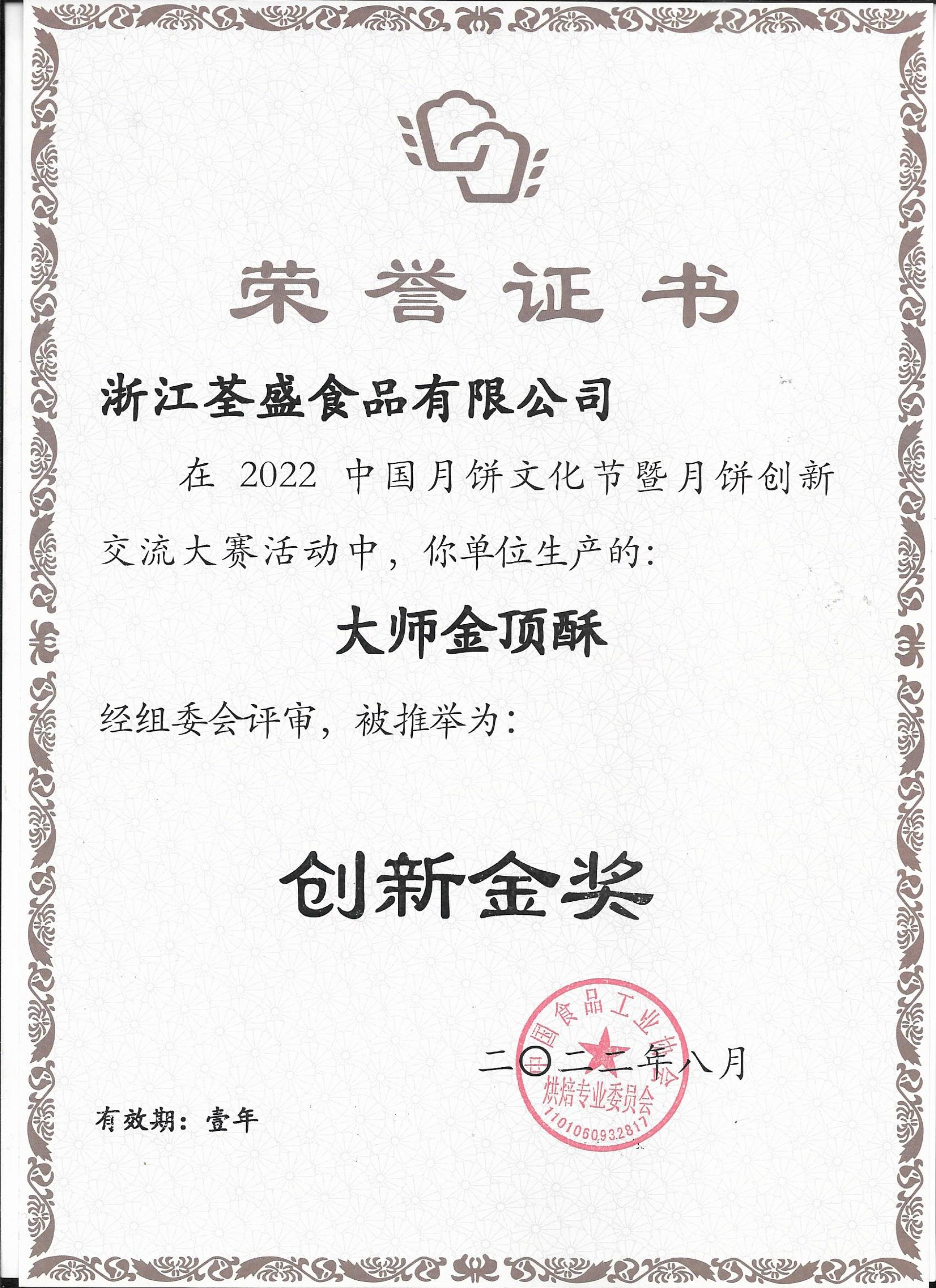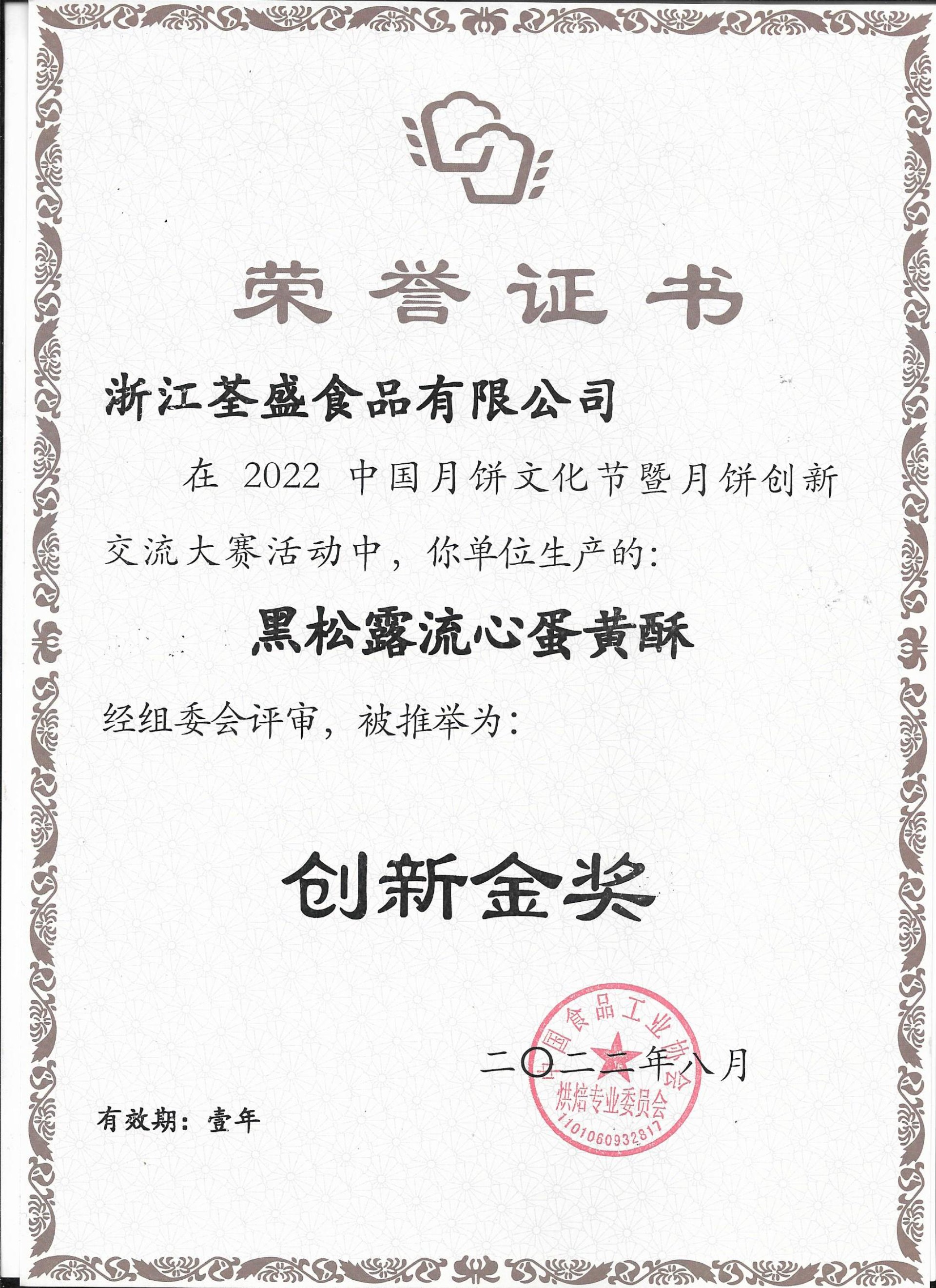 3. 中國(guó)食品工業(yè)協(xié)會(huì)授予荃盛《翡翠海苔廣式月餅》“金牌月餅”;
